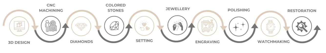 Our savoir-faire includes precision cutting of diamonds and colored stones, as well as watch and jewelry craftsmanship—encompassing 3D design, CNC machining, jewelry setting, polishing, watchmaking, and restoration.